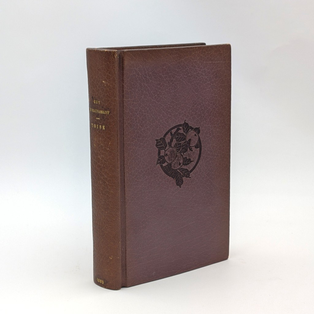 GUY DE MAUPASSANT. Toine. Paris, [1886], Marpon et Flammarion. In-12 (190 x 117 mm), plein maroquin lilas à la Bradel, décor à froid au centre des plats d’une composition florale, dos lisse, doublures et gardes de papier marbré, non rogné, couverture illustrée et dos conservés (René Kieffer).