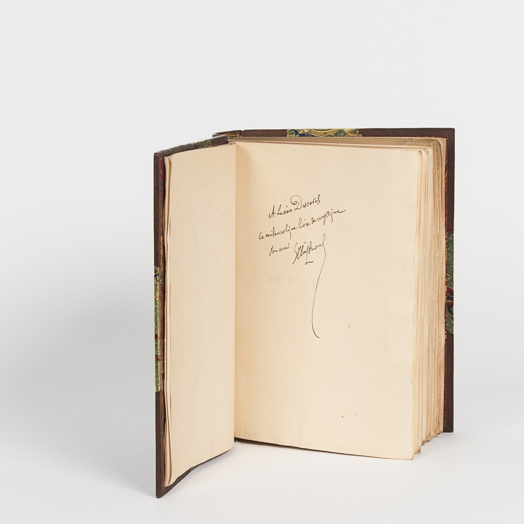 JORIS-KARL HUYSMANS. En route. Paris, Tresse & Stock, 1895. In-8 (185 x 130 mm), demi-maroquin havane à coins, plats de papier marbré, dos à nerfs, doublures et gardes de papier peigne, tête dorée sur témoins, couvertures conservées, étui et chemise moderne (reliure de l’époque).