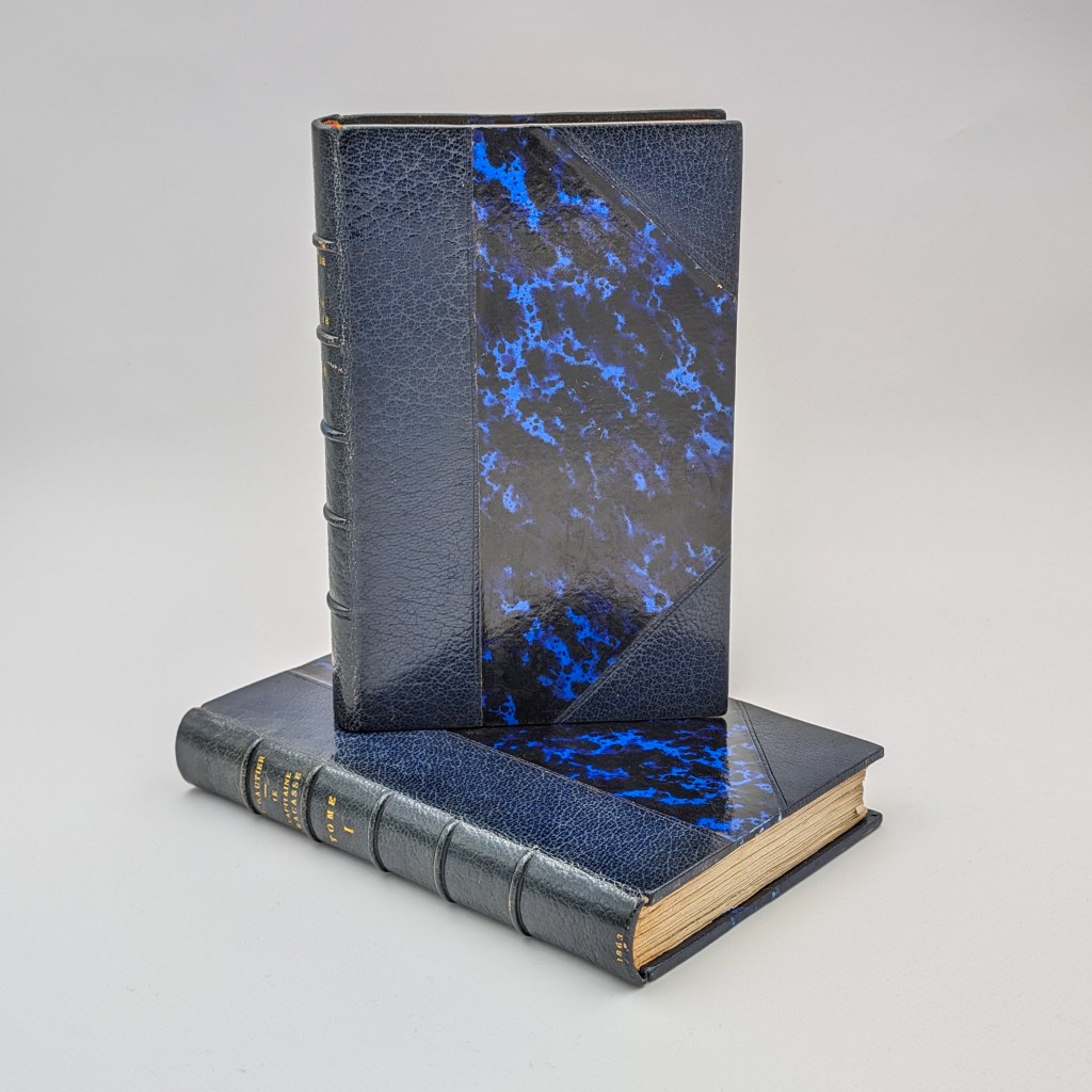 THEOPHILE GAUTIER. Le Capitaine Fracasse. Paris, Charpentier, 1863. 2 vol. in-12 (181 x 114 mm), demi-maroquin bleu marine à coins, plats de papier marbré bleuté, dos à nerfs, doublures et gardes et papier peigne, tranche de tête dorée (Pougetoux).